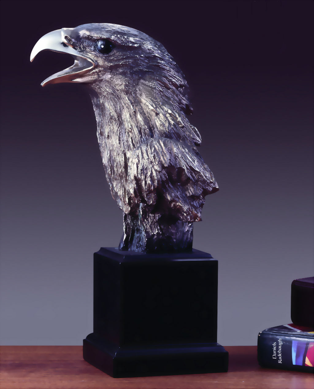 This Eagle Head Statue is individually pewter plated. Meticulously sculpted by hand to ensure this piece is of exceptionally fine detail as well as lasting durability. A unique and beautiful addition to your home or office.