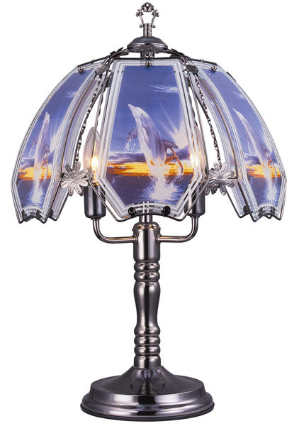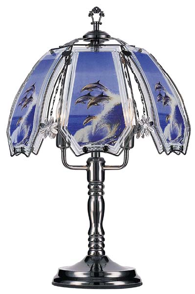 This UL Approved Dolphin Touch Lamp is made of 6 etched and painted glass panels with a base in chrome finish. This beautiful lamp has a reliable 3-way touch sensor control feature. You can adjust the light you need by simply t...