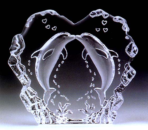 Adorable dolphins celebrate love and beauty in this gorgeous Kissing Dolphins Leaded Crystal Sculpture. Two dolphins meet in the center of this heart shaped sculpture with a tender kiss. Even the air bubbles look like hearts.