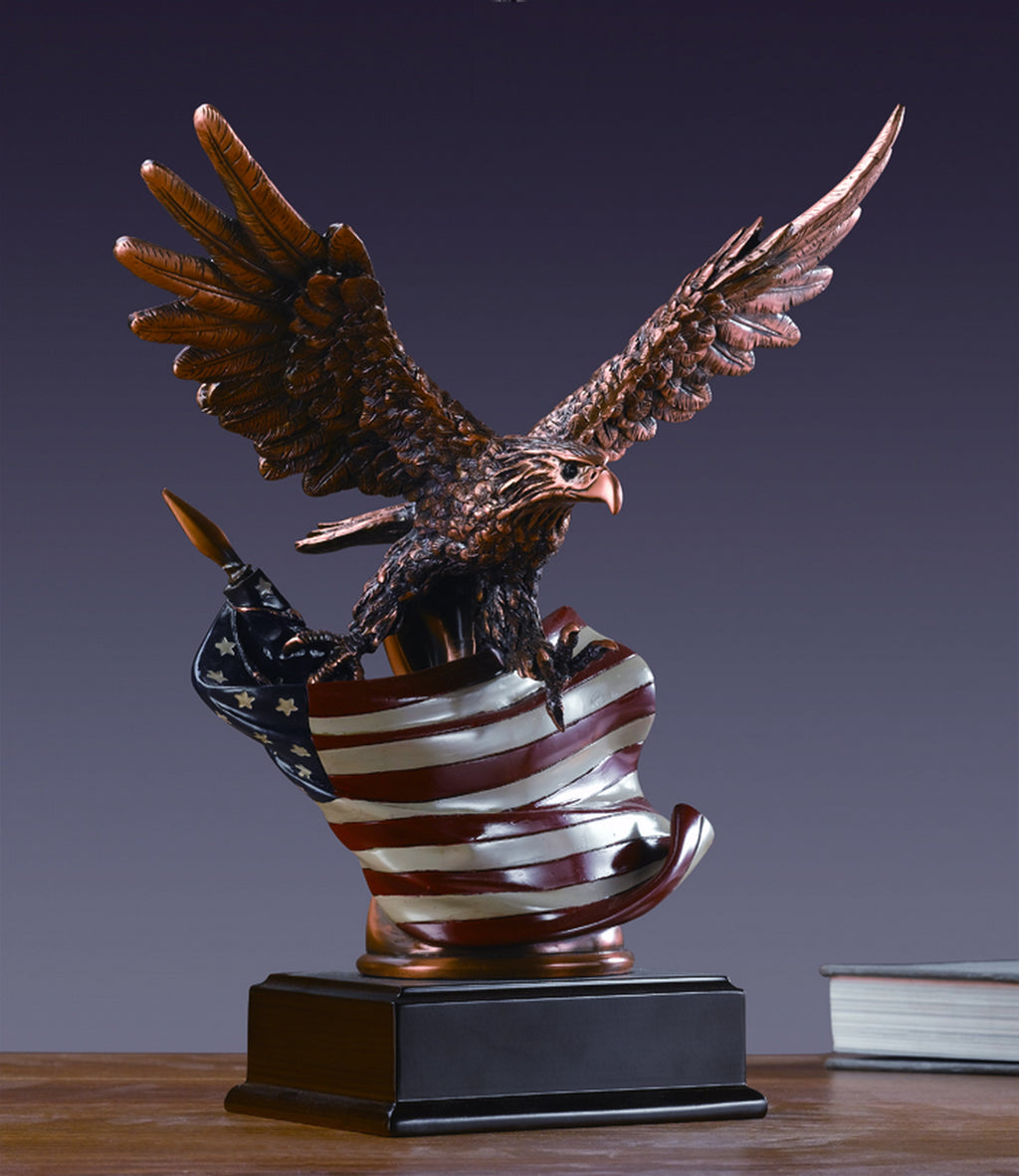 Bring elegance into your home or office with this stunning Small Eagle with American Flag Sculpture. Famous for quality, design and detail, each of these bronze electroplated resin sculptures represents the beauty of nature. wi...
