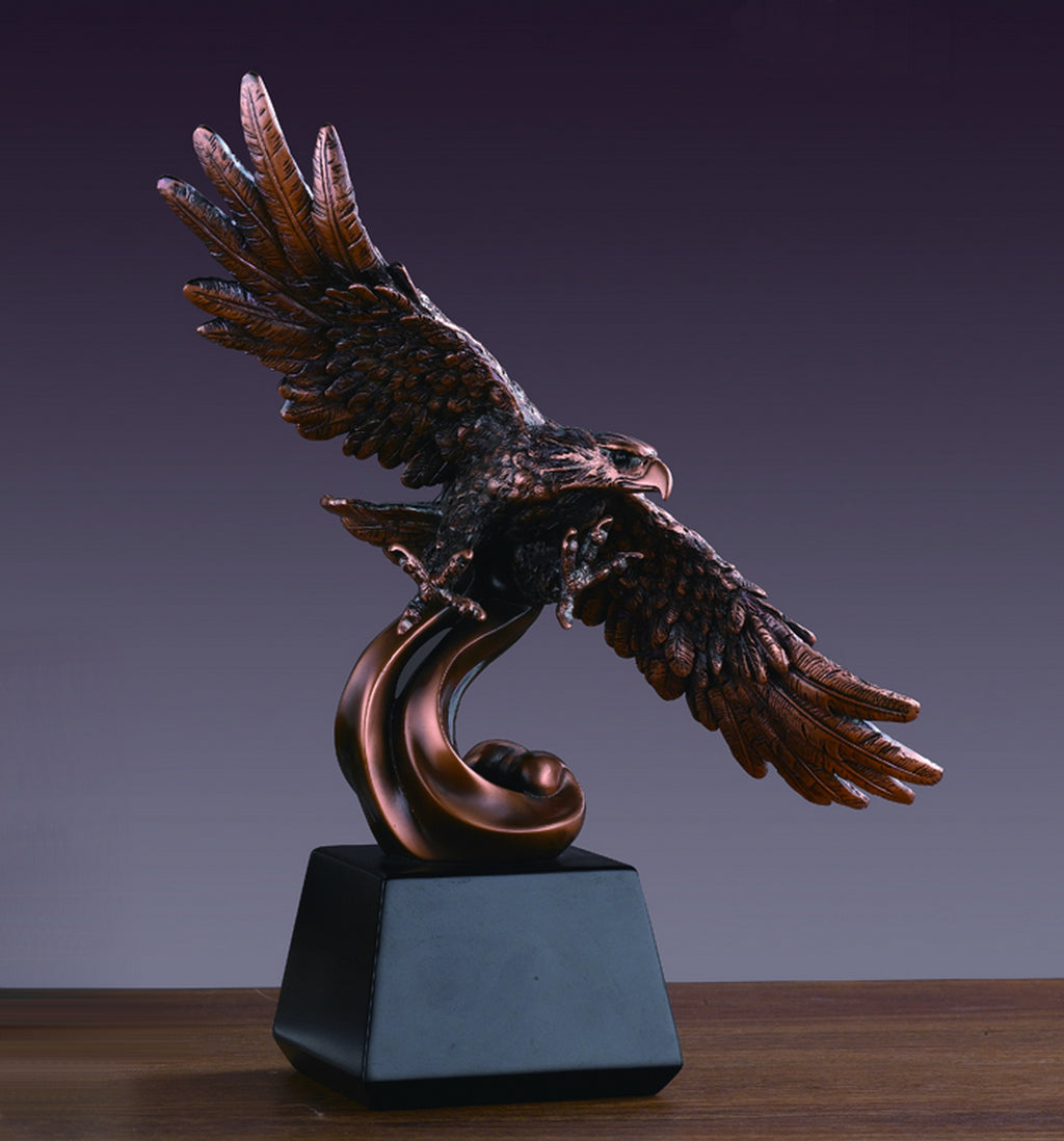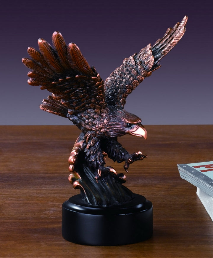 Bring elegance into your home or office with this Eagle in Flight Sculpture. Famous for quality, design and detail, each of these bronze electroplated resin sculptures represents the beauty of nature. with the finest detail, th...