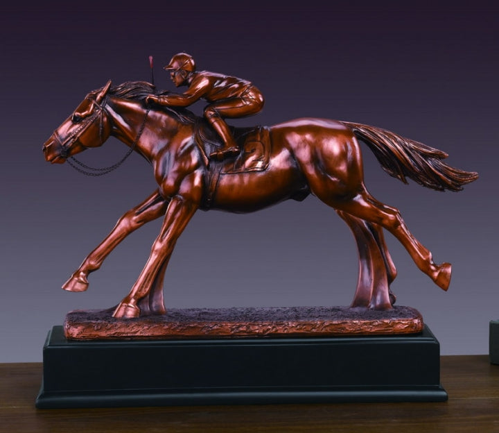 Bring elegance into your home or office with this stunning Race Horse with Jockey Sculpture. Famous for quality, design and detail, each of these bronze electroplated resin sculptures represents the beauty of nature. with the f...