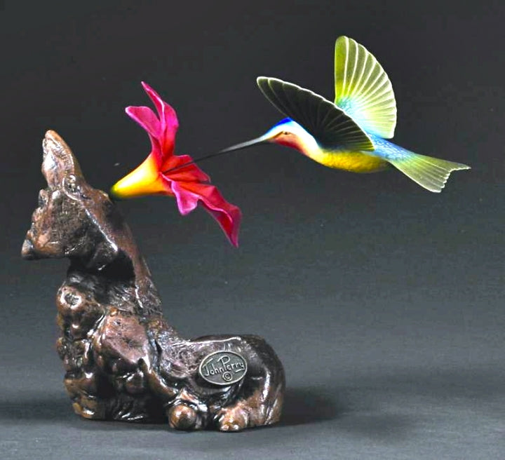 This stunning Multicolor Hummingbird Sculpture is mounted on a unique manzanita burl wood base that is now extinct. Handmade of a versatile resin compound called "Pellucida" that can be presented in a variety of colors and text...
