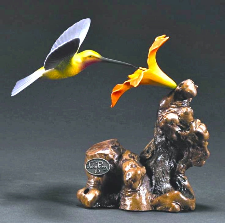 This stunning Blue/Yellow Hummingbird Sculpture is mounted on a unique manzanita burl wood base that is now extinct. Handmade of a versatile resin compound called "Pellucida" that can be presented in a variety of colors and tex...