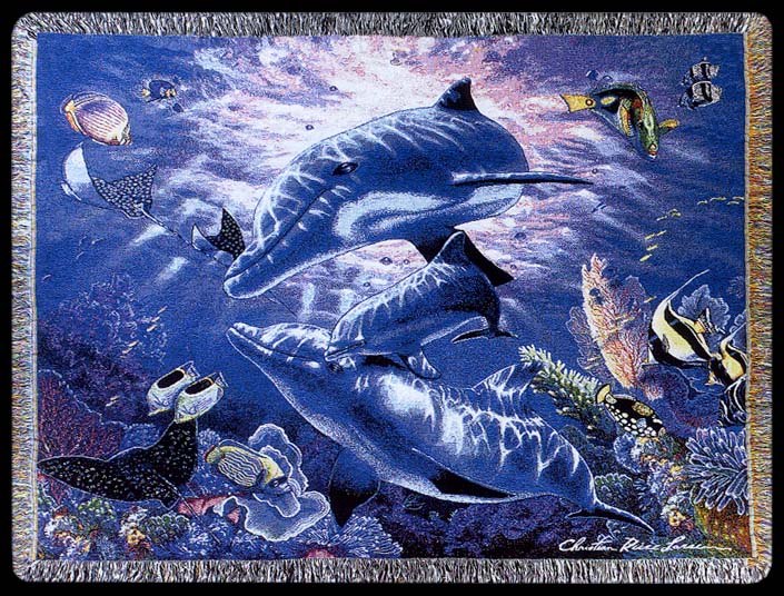 4.5 Feet X 5.5 Feet. This brilliant underwater scene depicts three peaceful dolphins swimming among the fish and reef. Cristian Riese Lassen's Perfect World is weaved into this stunning afghan! It expresses ...