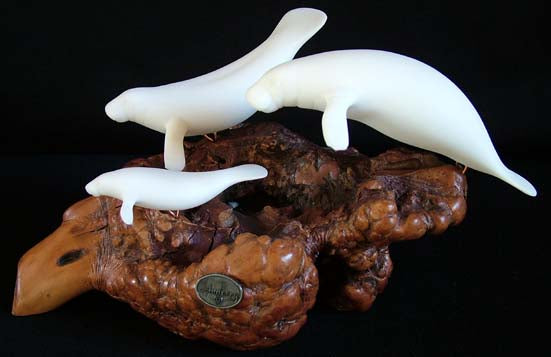 This unique Trio Manatees on Burlwood Base by John Perry is made of a versatile resin compound called "Pellucida" that can be presented in a variety of colors and textures and adapted by state of the art molding techniques. Air...