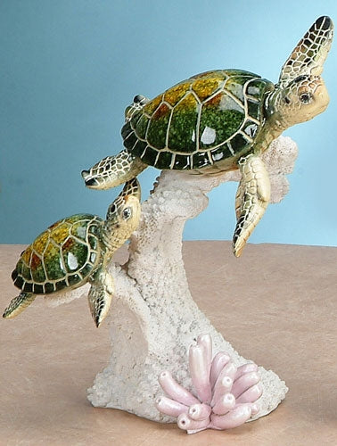 This magnificent Mother and Baby Sea Turtle Sculpture makes a great addition to any room or outdoor living area. With a traditional museum look it appears as though the sea life are swimming below the surface of the ocean. Ref...