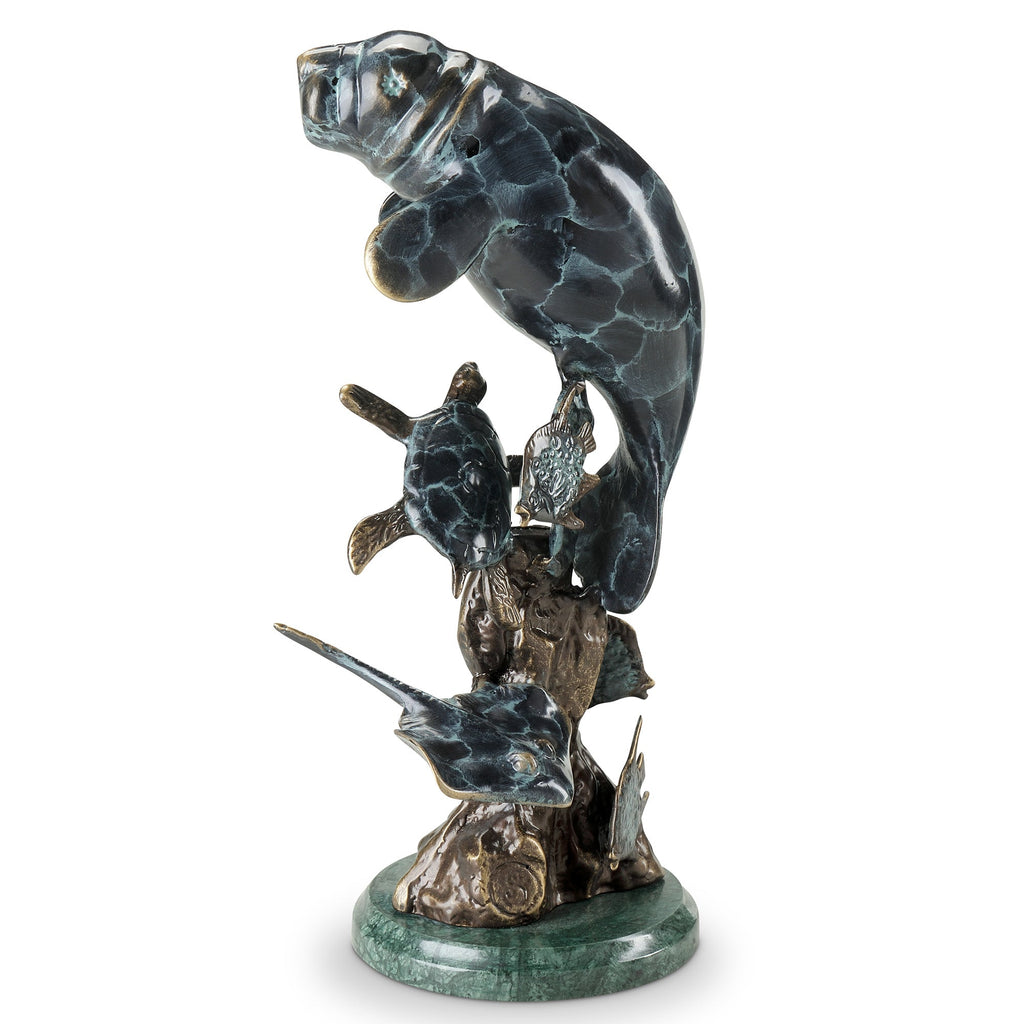 This magnificent Manatee & Friends Sculpture makes a great addition to any room or outdoor living area. With a traditional museum look it appears as though the sea life are swimming below the surface of the ocean. Reflecti...