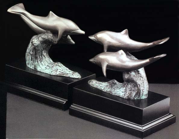 This "Dancing Doplhins" Sculpture is meticulously hand finished using the hot patina technique, the same method used in works found in the finest art museums. This art piece is first applied a cold, chemical patina to the "L...