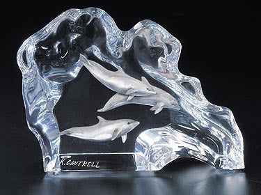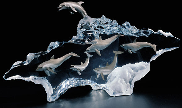 This Limited Edition Dolphin Sculpture is created by award-winning artist Kitty Cantrell. "Destiny", reminiscent of Cantrells earlier "Wave Dance", enters a new dimension as a single dolphin breaks through a Lucite wave.