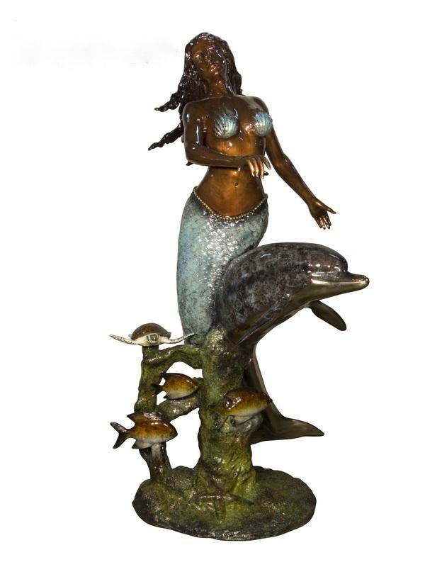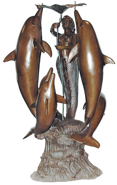 This magnificent Mermaid & Dolphins Sculpture makes a great addition to any room or outdoor living area. With a traditional museum look it appears as though the sea life are swimming below the surface of the ocean. Reflect...