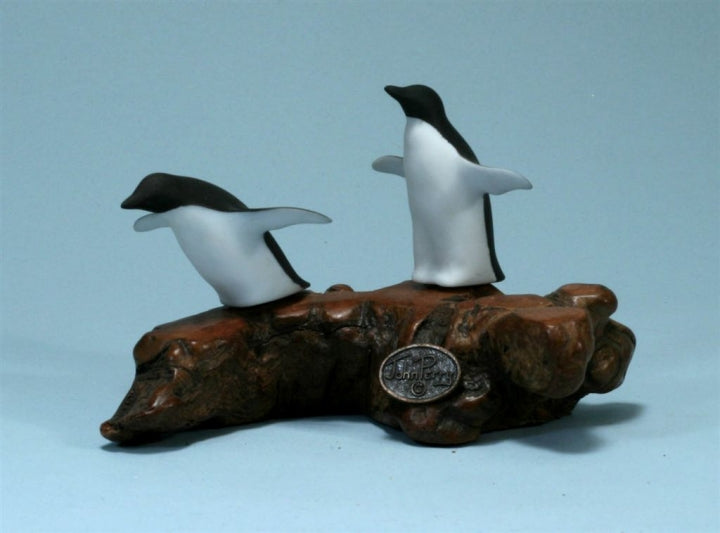 This stunning Double Penguin Sculpture is mounted on a unique burl wood base. Handmade of a versatile resin compound called "Pellucida" that can be presented in a variety of colors and textures and adapted by state of the art m...