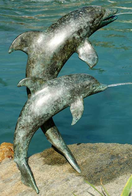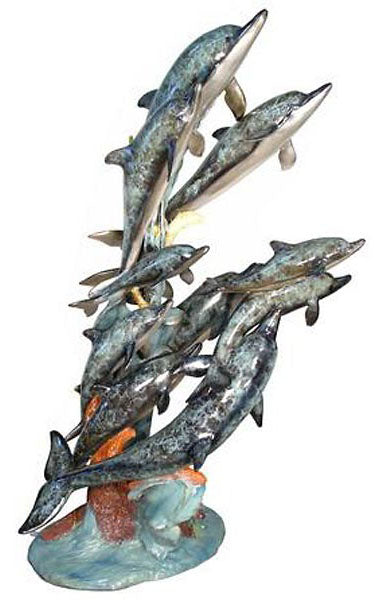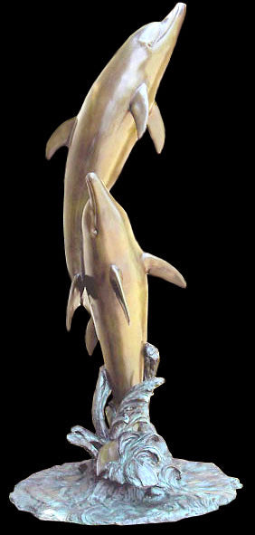 This Four Jumping on Wave Dolphins Fountain is made of bronze. It is meticulously sculpted by hand and cast by the "Lost Wax" method, one at a time, ensuring exceptionally fine detail and lasting beauty. "Lost wax" casting dates back thousands of years. This is the most precise metal casting technique in existence, ensuring accurate reproductions of the original sculpture and exquisite detail. While modern methods and materials have improved the technique, it is still an extremely labor intensive and expensive process.