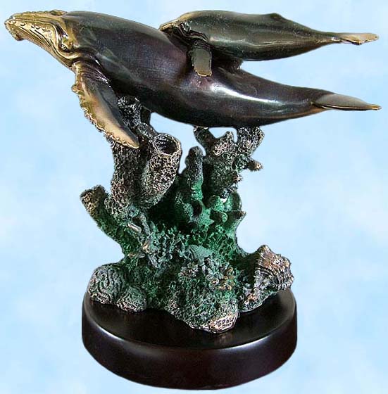 This magnificent Two Breaching Whales Sculpture makes a great addition to any room or outdoor living area. With a traditional museum look it appears as though the sea life are swimming below the surface of the ocean. Reflectio...