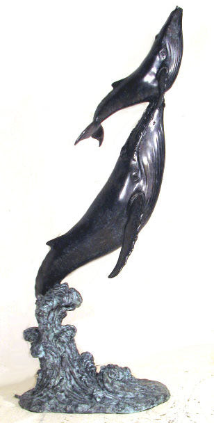 This magnificent Two Breaching Whales Sculpture makes a great addition to any room or outdoor living area. With a traditional museum look it appears as though the sea life are swimming below the surface of the ocean. Reflectio...