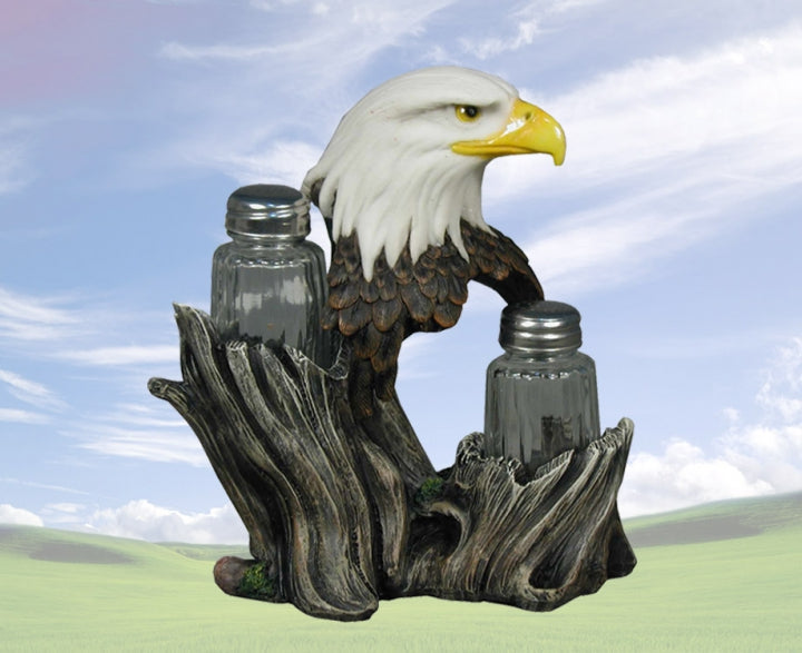 This "Proud Seasons" Eagle Salt & Pepper Holder is a great way to add a touch of wildlife to your kitchen and dining decor. Resting in a tree trunk, with natural colors of the forest and wildlife accents, this functional pi...